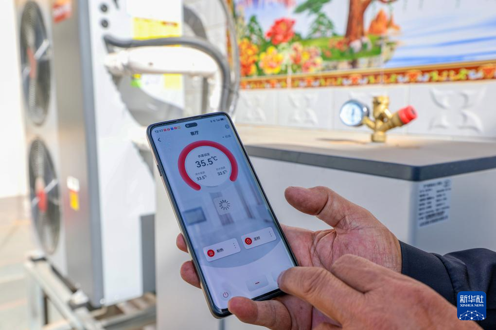 11月27日,宁夏吴忠市同心县豫海镇园艺村,村民用手机调节空气能采暖设备的水温。