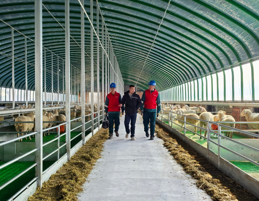 完成箱变验收后,服务队员又来到新建成的肉羊养殖场。在宽敞的羊舍内,自动喂料机正沿着轨道缓缓移动,将精准配比的饲料投放到食槽中;恒温饮水槽自动加热,保证羊群在零下十几度的严寒中也能喝上温水;顶部的自动卷膜器根据光照和温度自动调节通风口开合,整个养殖过程充满了“科技范儿”。