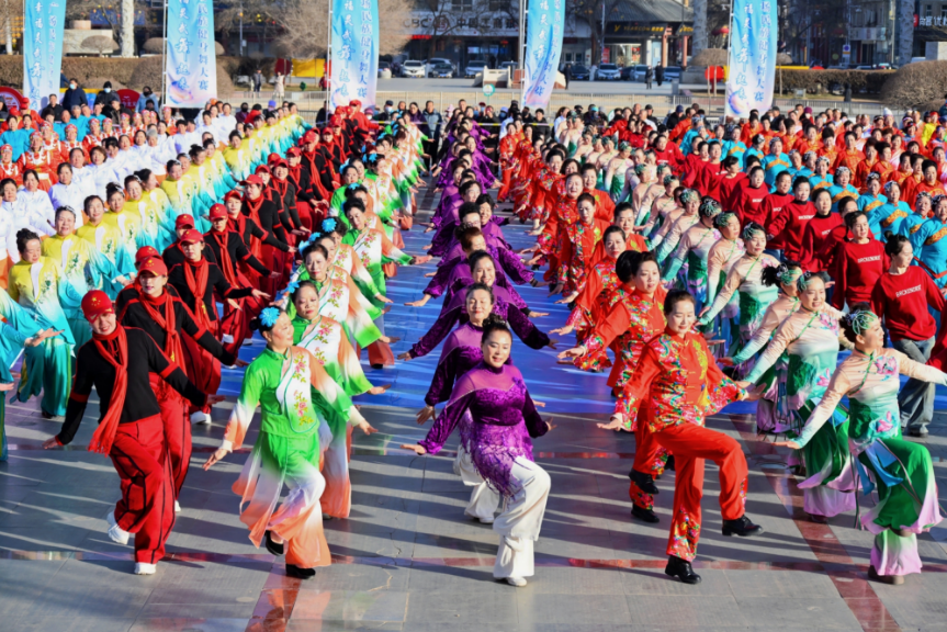 上午10时许,激昂欢快的集体舞蹈《美丽中国》拉开活动帷幕,1000多名选手不惧寒冷,在冬日暖阳下随旋律起舞,场面蔚为壮观。参赛队员身着色彩绚丽的服装,精神抖擞、神采飞扬,伴随着《祖国你好》《吉祥欢歌》《幸福中国一起走》《春风十万里》等耳熟能详的旋律依次登台。