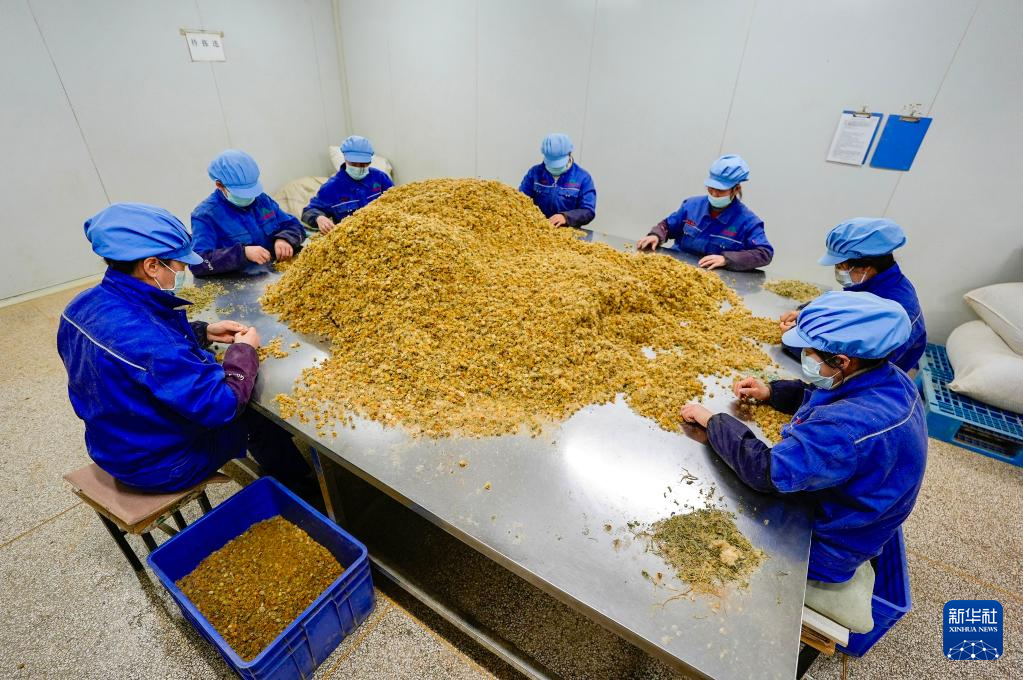 1月26日,工作人员在宁夏固原市隆德县一家药材加工企业分拣旋覆花。