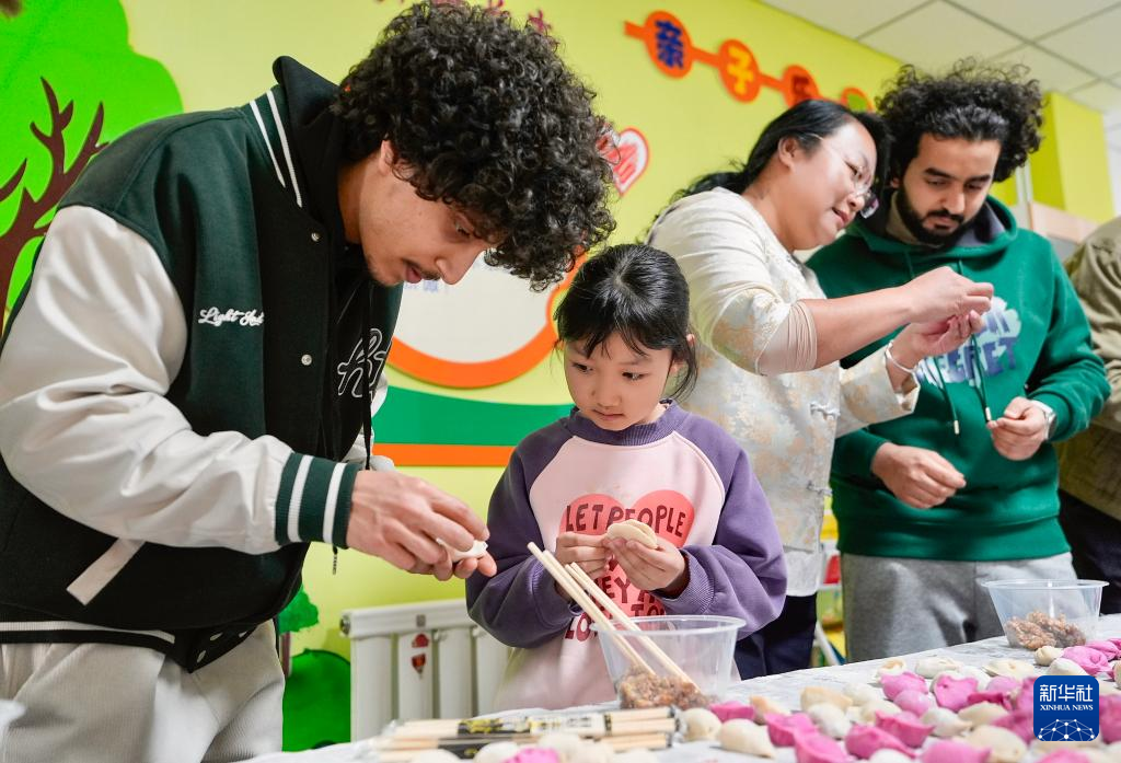 春节临近,北方民族大学国际教育学院的留学生受邀来到位于宁夏银川市西夏区的芦花洲社区,体验舞龙、扭秧歌、包饺子等活动,同当地居民一起感受中国的喜庆年味。新华社记者 杨植森 摄