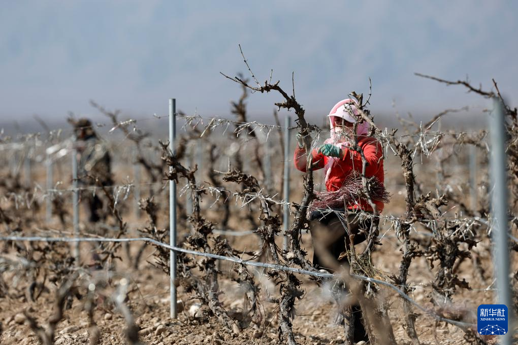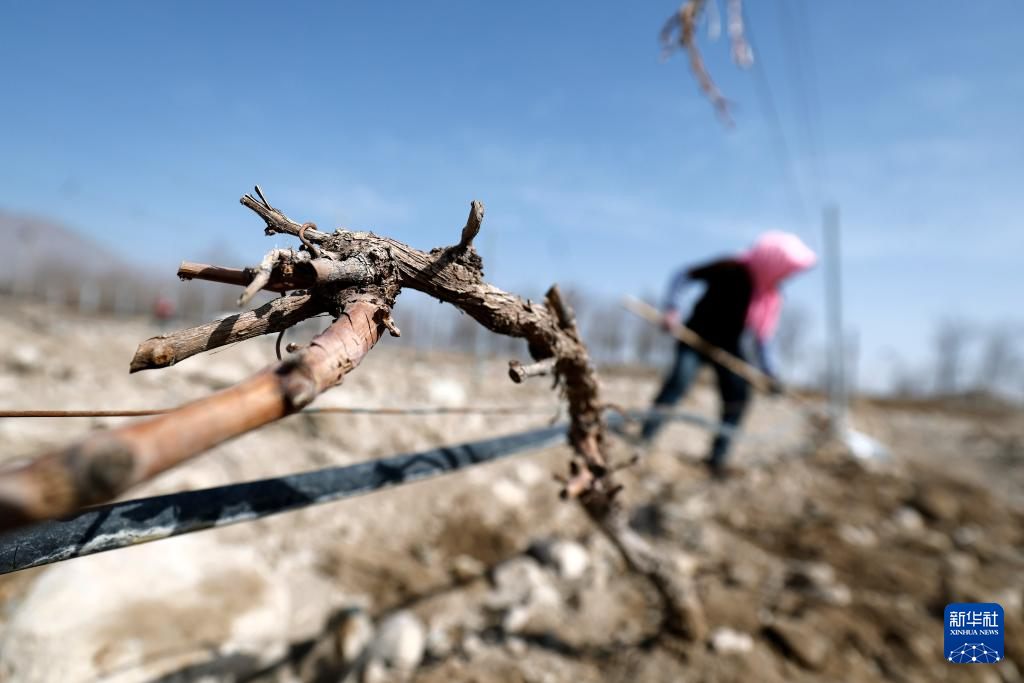 随着气温回暖,在宁夏贺兰山东麓的优质酿酒葡萄产区,数十万亩酿酒葡萄结束“冬眠”,迎来春季展藤。冬藏埋土、春季展藤,是我国北方一些葡萄产区独特的农耕措施,以避免冬季低温冻伤葡萄藤。宁夏贺兰山东麓位于北纬37度至39度,是我国最大的酿酒葡萄集中连片种植区和酒庄酒产区。新华社记者 王鹏 摄
