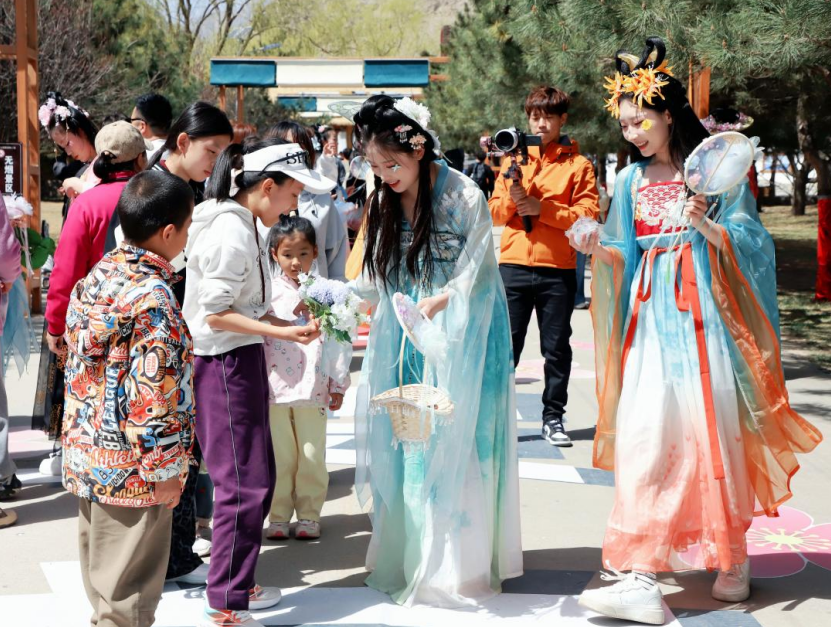 在贺兰山国家森林公园内,扁桃花仙巡游成为景区核心亮点,身着古风服装的 “花仙” 漫步花海、循山巡游,与游客近距离开展趣味互动,巡游队伍所到之处,游客驻足打卡、踊跃参与。景区推出汉服免票、仙侠旅拍、透卡打卡等体验,以多元玩法让游客深度感受贺兰山春日之美。