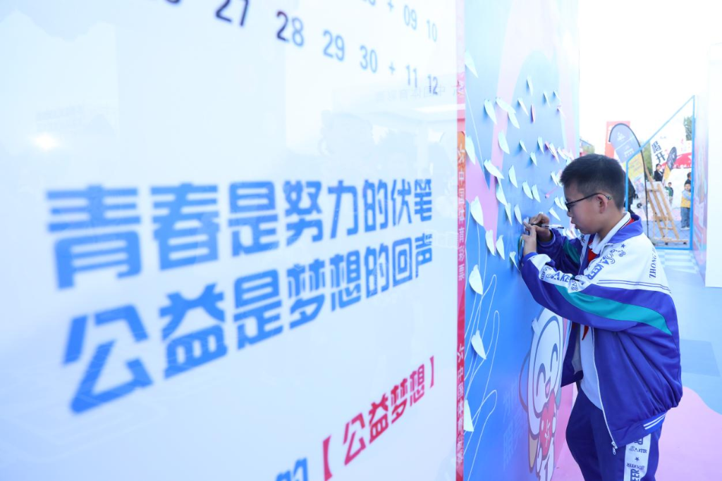 2025年5月30日,在中卫市市政广场的中国体育彩票公益展区,一名学生写下公益寄语。