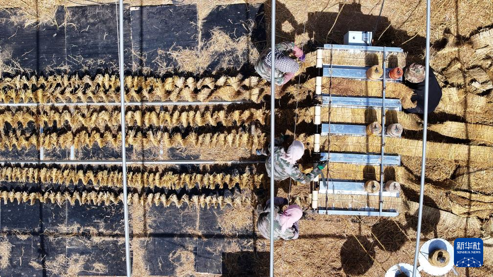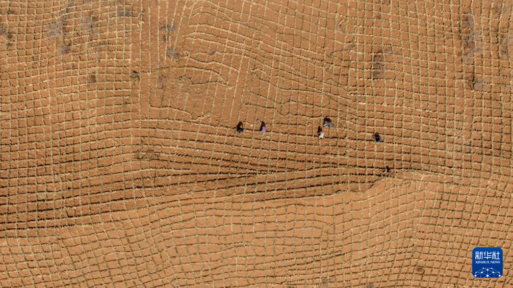 4月10日,在宁夏中卫市沙坡头区迎水桥镇黑林村,治沙工人用机械编织“刷状网绳式草方格沙障”(无人机照片)。