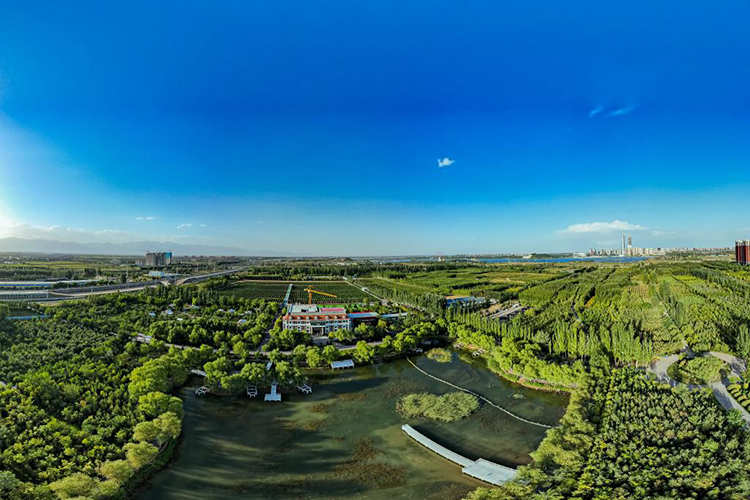 贺兰山运动休闲公园里绿树成荫、湖光粼粼,健身步道环绕其中。(银川市委宣传部供图)