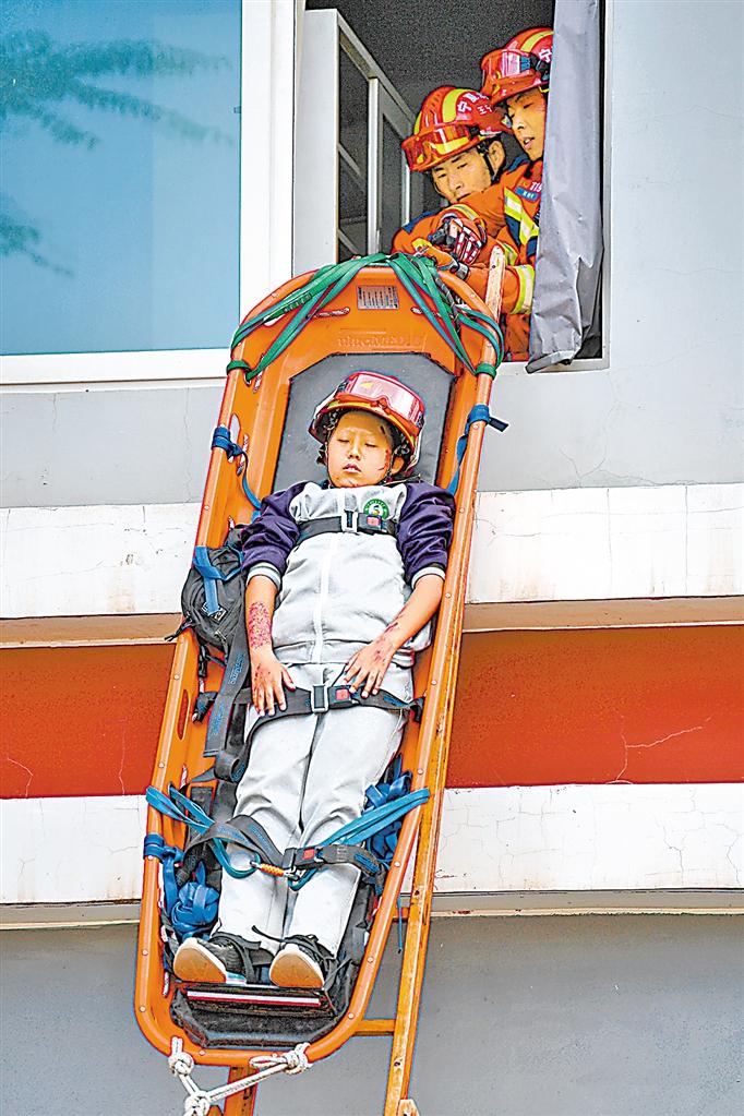 通过侦察确定受困者位置后,救援人员利用绳索系统救援高处受困者。记者 王婧雅 马楠 王洋 摄