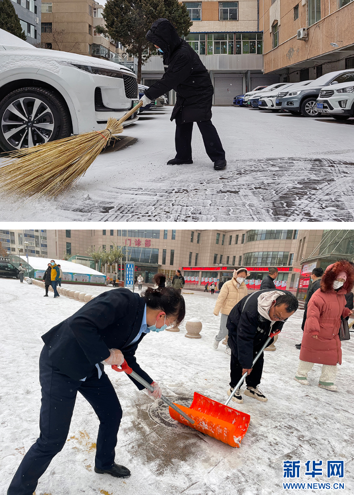 清扫积雪。(拼版图片) 12月14日,宁夏银川迎来今冬首场降雪。新华网 纪桂红 摄