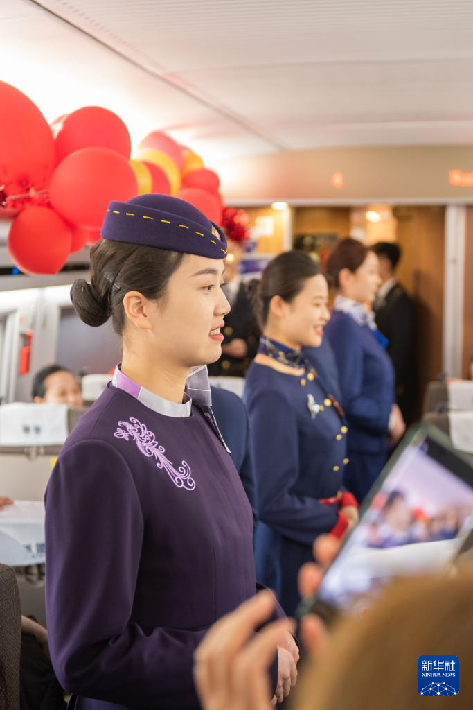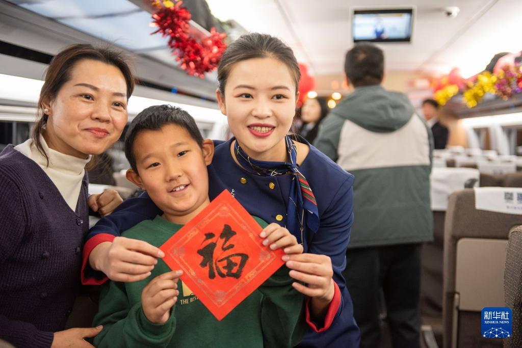 1月10日,在银川至贵阳北D1709/8次动车组列车上,列车员与旅客合影。