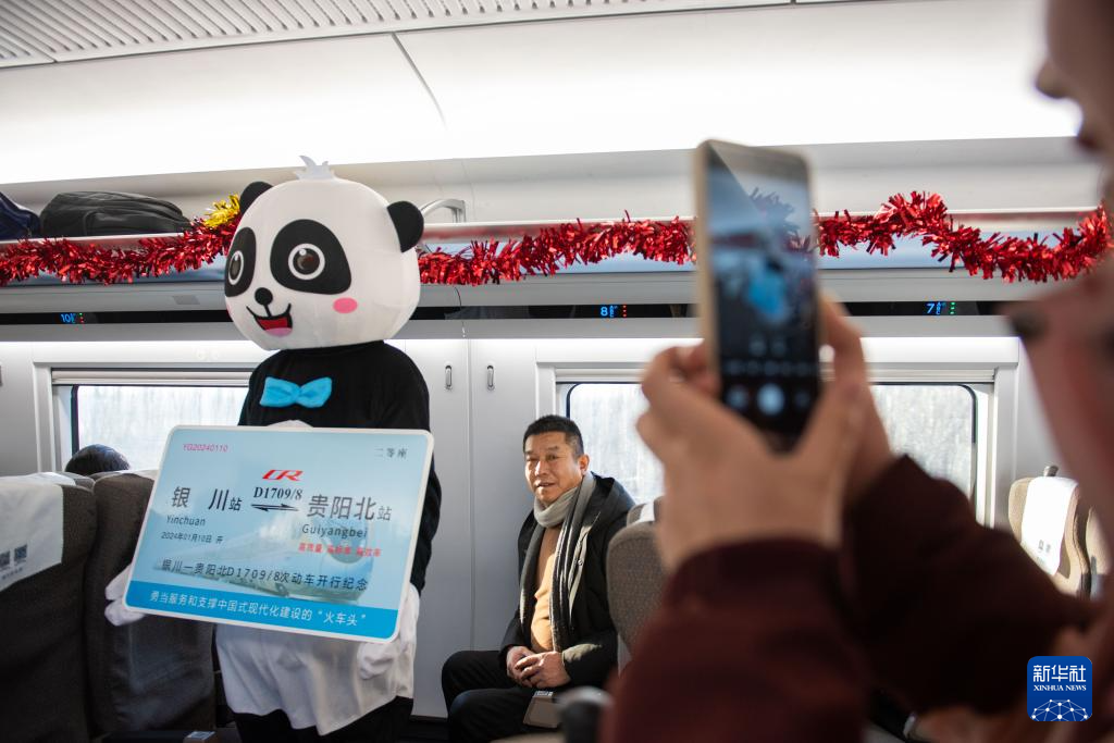 1月10日,旅客在银川至贵阳北D1709/8次动车组列车上拍照。