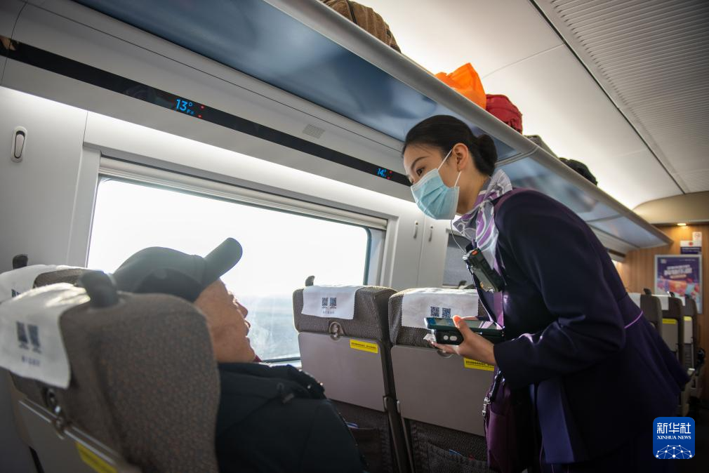 1月10日,在银川至贵阳北D1709/8次动车组列车上,列车员为旅客服务。