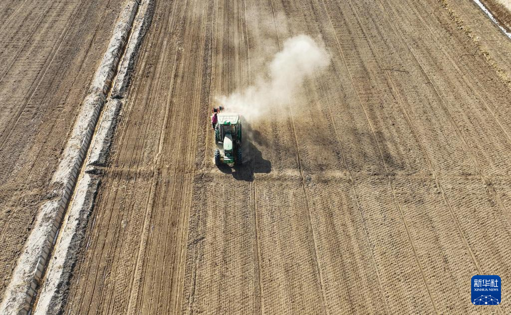 3月7日,在宁夏石嘴山市平罗县通伏乡新潮村,农户使用农机进行春耕(无人机照片)。