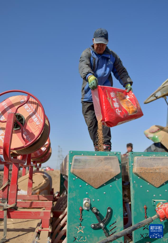 3月7日,在宁夏石嘴山市平罗县通伏乡新潮村,农户将小麦种子倒入农机。