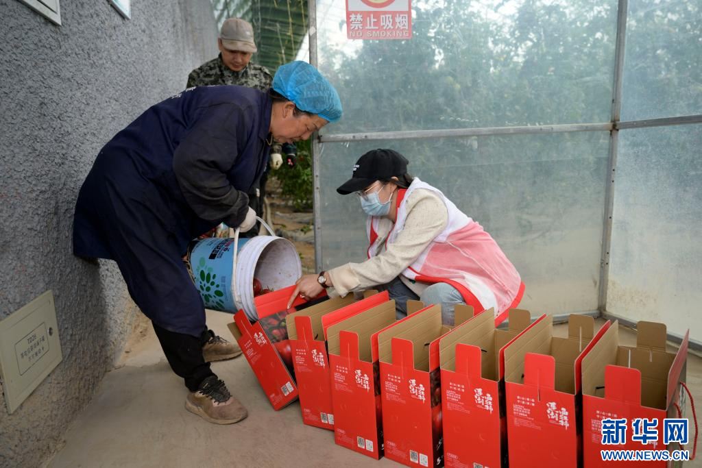 4月2日,农户在日光温棚将采摘的西红柿装箱准备销售。