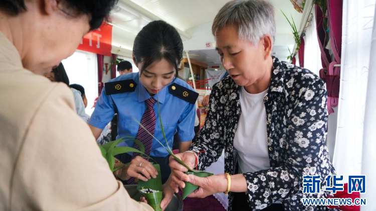 在列车餐车里,乘务员们用香包、艾草、红绳等饰品将车厢装扮一新,“粽情端午·文明出行”主题活动中,主持人介绍了端午节的由来和家乡的民俗活动,列车工作人员还精心准备了舞蹈、乐器独奏、歌曲演唱、京剧等节目表演,旅客们随着欢快的旋律一起哼唱、拍手,节日的氛围弥漫开来。