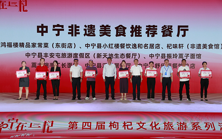为进一步推广枸杞与非遗美食相结合的康养理念,推动枸杞文旅特色宣传,中宁县小红楼餐饮逸和名居店、中宁县丰安屯旅游度假区新天地生态餐厅、中宁县振玲蒿子面馆等8家餐厅被授予“中宁非遗美食推荐餐厅”称号,莫淑兰、王银鹏、褚晓玲等10名“大美中宁”摄影大赛获奖者获得荣誉表彰。
