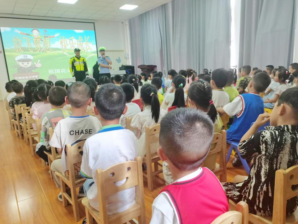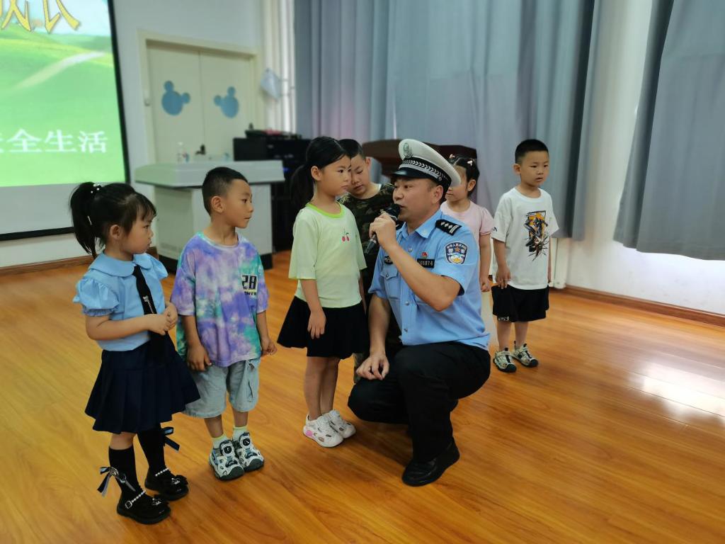 民警在银川市西夏区第二十三幼儿园开展暑期交通安全宣传活动。