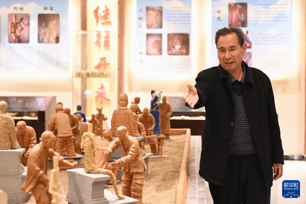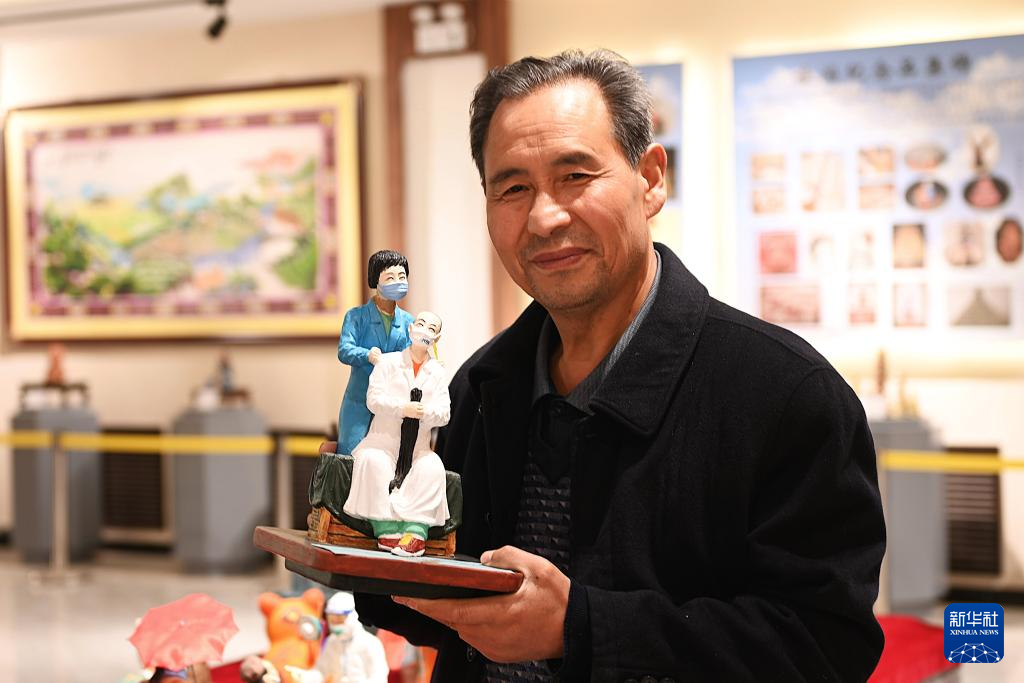 10月31日,杨佳年在隆德县杨氏彩塑艺术馆展示获奖彩塑作品。