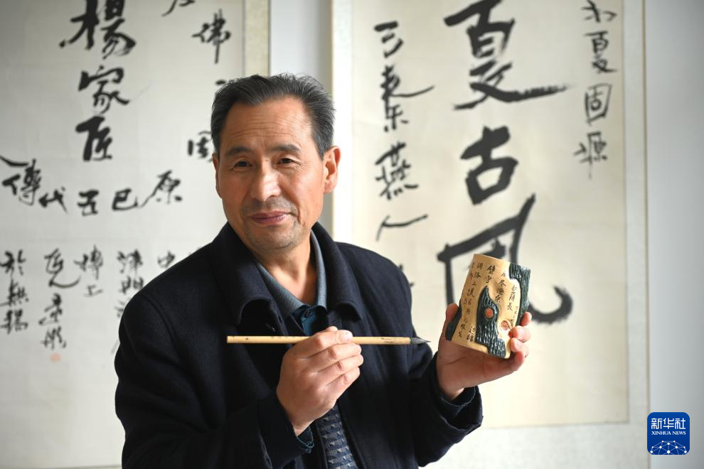 10月31日,杨佳年在隆德县杨氏彩塑艺术馆展示彩塑笔筒。