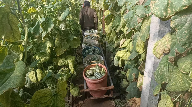 走进温棚内,空气中弥漫着一股沁人心脾的瓜香,一个个沉甸甸的博洋九号香瓜挂在秧架上,散发着阵阵浓郁的香味,赵军与其家人紧张而有序地忙碌在翠绿的瓜秧之间,他们精心挑选着长势喜人的香瓜,小心翼翼地采摘并装入桶中。随后,这些饱满硕大的果实被集中存放,以便进行细致地选果工作。
