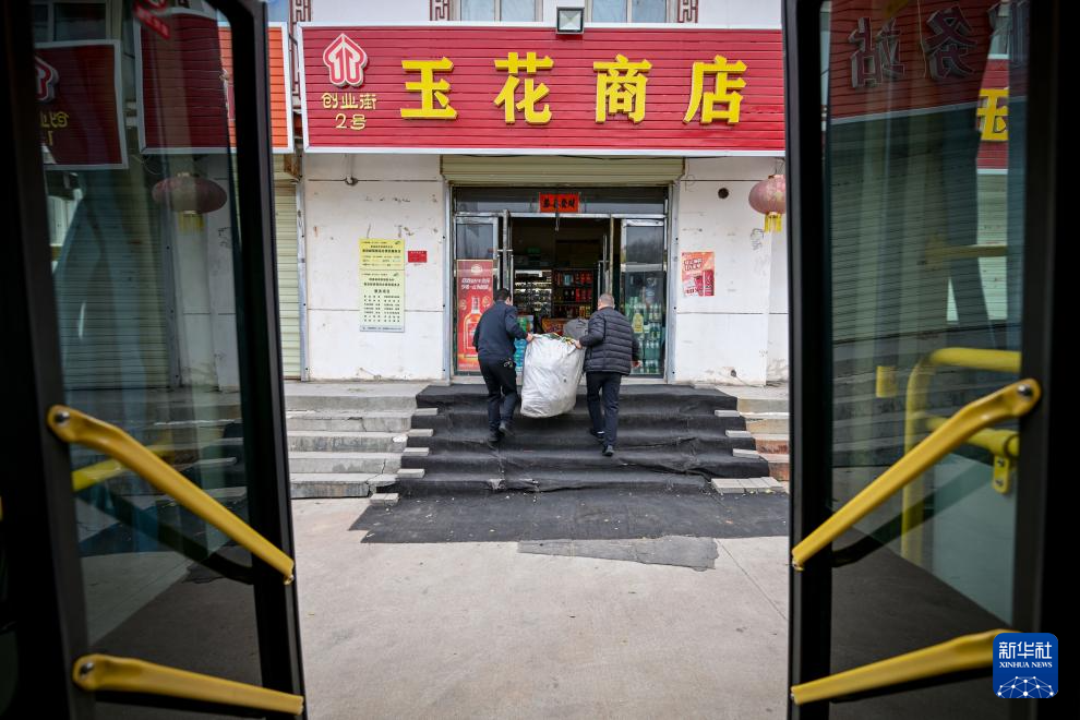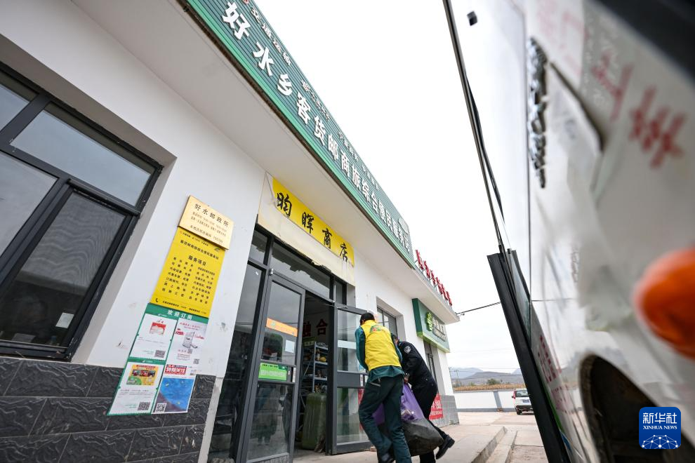 11月9日,隆德县公交车司机和好水乡客货邮商旅综合便民服务站经营者从公交车上卸下快递物品。