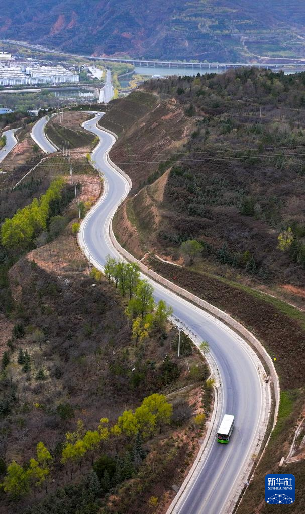 11月9日,一辆载有乘客和快递物品的公交车从隆德县城驶出(无人机照片)。