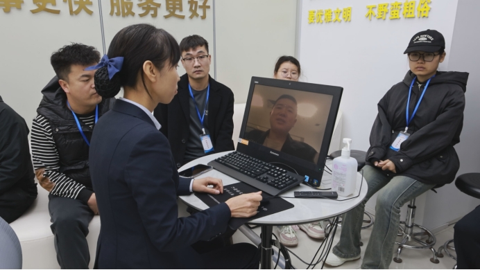 工作人员现场演示视频帮办导办流程,连线预约企业现场办理营业执照。
