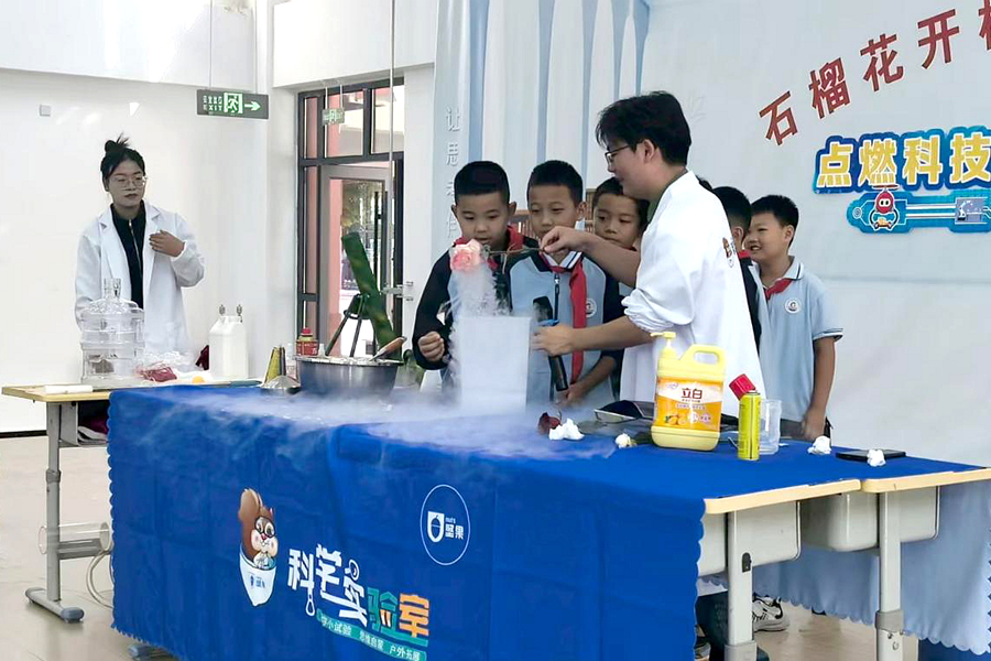 科学实验现场的同学们情绪高涨,成了活动的焦点。“大家注意看,我现在要把这团火放在手上!”随着实验老师话音落下,一团蓝色火焰在老师掌心跳跃。“老师,你不烫吗?”孩子们惊叹不已。“这是因为燃料燃烧时产生的热量被水分吸收,加上燃烧速度快,所以手掌不会受伤。”实验老师一边操作,一边解释其中的科学原理。随后,“粉碎玫瑰花”“液氮大炮”“马德堡半球”“腾云驾雾”等9个趣味实验接连上演,同学们不仅惊呼连连,还亲自上台体验,沉浸在液氮营造的梦幻“仙境”中,在欢乐中播下了科学的种子。