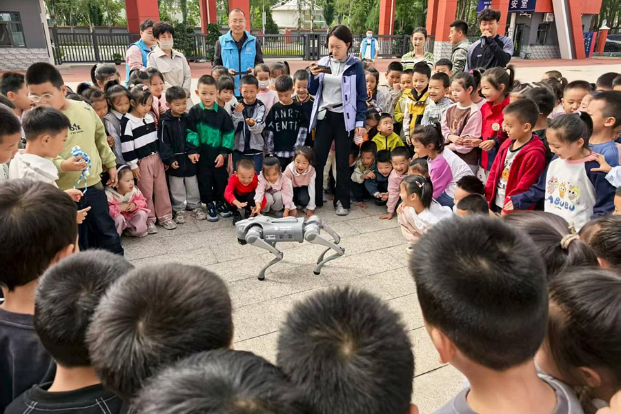 机器狗展示区域同样人气爆棚。讲解员操控机器狗演绎舞蹈、握手、跳跃、伸懒腰等一系列灵活多变的动作,机器狗憨态可掬的模样逗得师生们开怀大笑。讲解员还向孩子们介绍了机器狗的工作原理:“它身上装有多个传感器和电机,就像我们的眼睛和肌肉一样,能感知周围环境并做出动作。”不少孩子围在机器狗身边,仔细观察它的关节和传感器,眼神里满是对科技的向往。