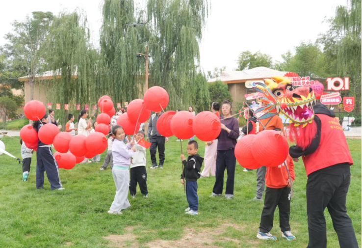 与此同时,贺兰山脚下的兰一生态园围绕亲子互动与创意体验,推出系列特色活动。“祖国山河拼出来”自然拼图挑战赛在兰多多亲自然乐园举行,孩子们在家长陪伴下拼出完整的中国地图,齐声合唱《我和我的祖国》,并放飞承载祝福的空飘气球。“萌娃造红龙・灯笼趣游园”活动也吸引了众多家庭参与,亲子共同制作灯笼并串联成“国庆红龙”,提灯游园,展现出一幅家国同乐的温馨画面。