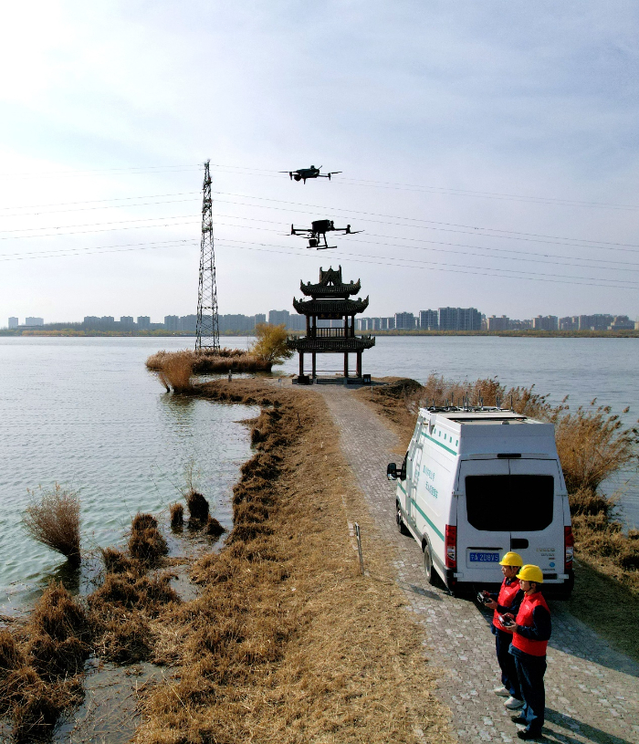 11月12日,在宁夏回族自治区银川市金凤区,国网银川供电公司输电运检中心员工利用大疆M350及M4智能无人机设备对110千伏花安线进行线路巡视、红外监测,保障输电线路安全运行。袁宏彦 摄