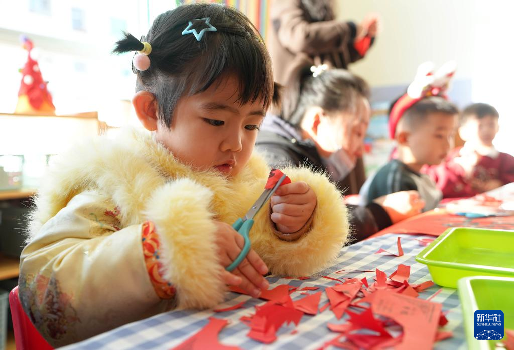 12月27日,孩子们在剪纸艺人的带领下体验剪纸艺术。