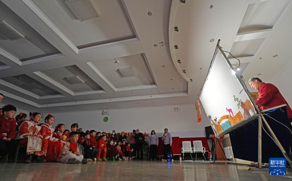 12月27日,孩子们在观赏皮影戏表演。