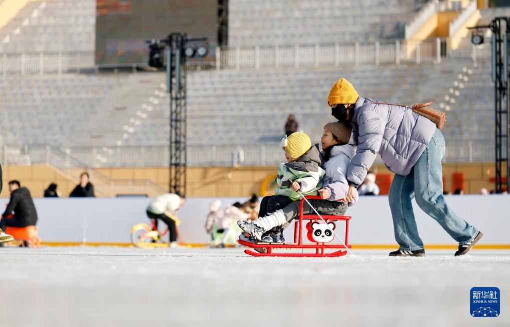 1月17日,人们在银川文旅集团览山公园落日冰场玩耍。