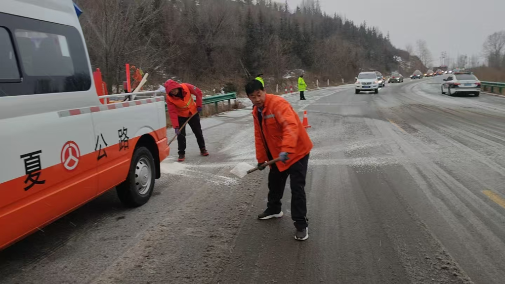 针对降雪量大、气温骤降的南部山区重点路段,宁夏各地交通执法、公路养护人员顶风冒雪加密路网巡查频次,精准排查国省干线、急弯陡坡、桥梁隧道、临水临崖等易结冰安全隐患路段。宁夏交通运输部门调配除雪车、撒布机等专业设备,对积雪路面开展循环除雪、同步撒布融雪剂与防滑砂,快速清除路面积雪、破除路面结冰,全力消除道路安全隐患。