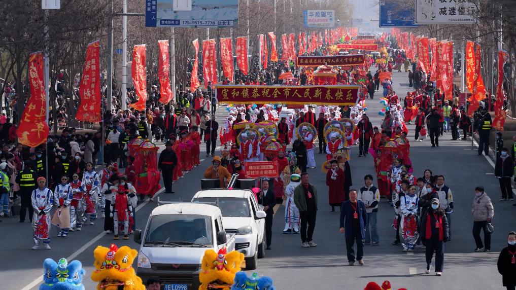 新华网银川3月3日电(记者马思嘉)3日,元宵佳节,宁夏回族自治区中卫市五馆一中心锣鼓喧天,人潮涌动。“奋进新中卫·吉祥过大年”2026年春节社火暨舞龙舞狮展演比赛在此举行,中卫市40余支队伍、近4000名表演者参与巡游展演。