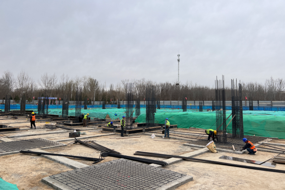 走进灵武市城区街道东盛街与西平路交叉口的全民健身中心项目施工现场,工地内机械轰鸣、人员忙碌,一派热火朝天的建设景象。施工人员正紧张开展主体基础承台钢筋绑扎、支设作业,钢筋骨架整齐规范、支撑牢固,大型机械设备协同作业,各工序衔接有序、稳步推进。