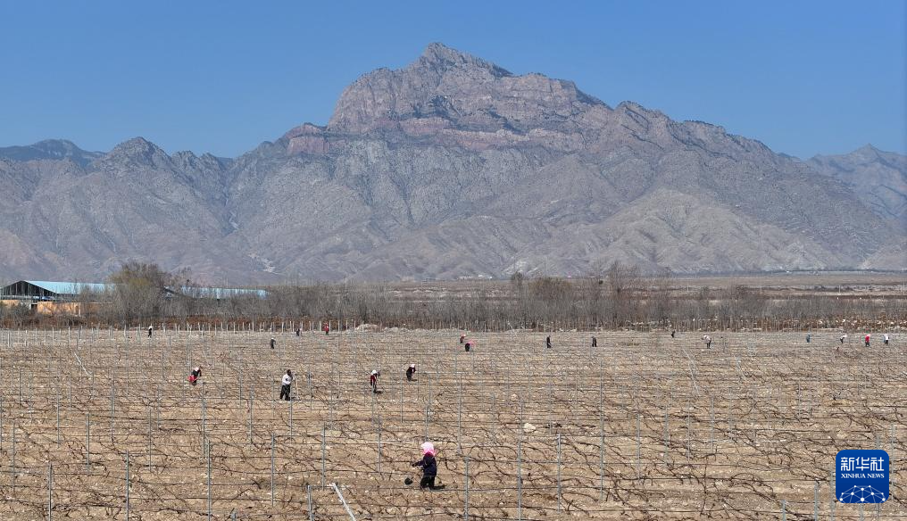 随着气温回暖,在宁夏贺兰山东麓的优质酿酒葡萄产区,数十万亩酿酒葡萄结束“冬眠”,迎来春季展藤。冬藏埋土、春季展藤,是我国北方一些葡萄产区独特的农耕措施,以避免冬季低温冻伤葡萄藤。宁夏贺兰山东麓位于北纬37度至39度,是我国最大的酿酒葡萄集中连片种植区和酒庄酒产区。新华社记者 王鹏 摄