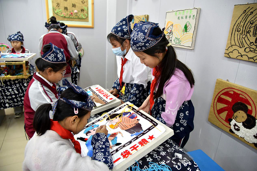 走进利通区第十一小学非遗工坊,孩子们围坐桌前,凝神专注于手中的麻编与绒绣。六年级学生马涵颖正细心穿针引线,一幅以黄河为主题的作品渐趋成型。“初学时常被针扎到手,绒线也总打结,如今已能熟练绣出家乡的黄河、稻田。”她笑着说道,一针一线,皆是心中对家乡的深情。