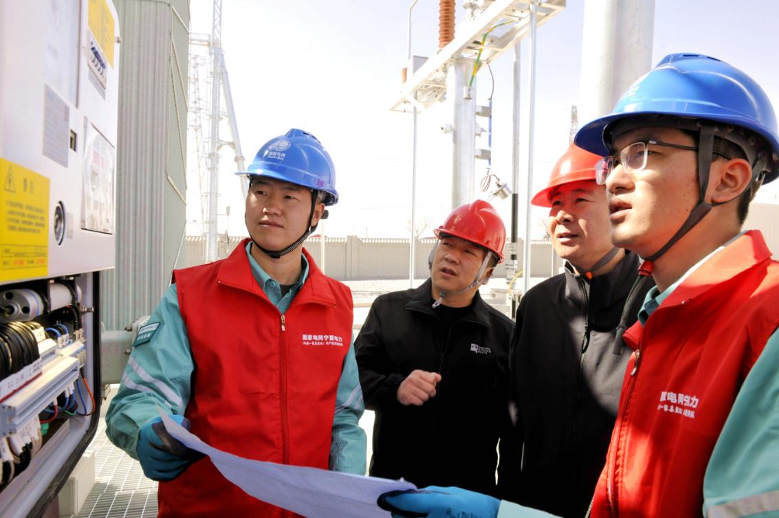 4月9日,国网宁东供电公司工作人员在位于宁夏吴忠市盐池县王乐井乡石山子村的盐州第二储能电站开展用电检查,提供技术指导,全力做好并网服务。周序鹏 摄