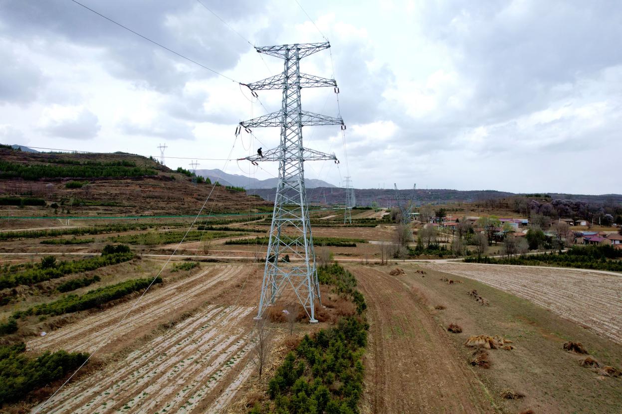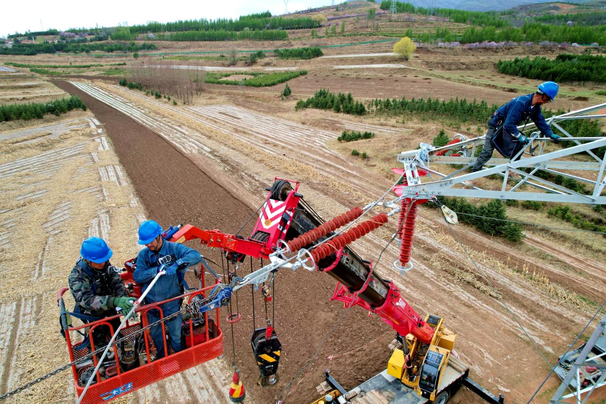 4月14日,在宁夏固原市泾源县大湾乡,国网固原供电公司员工正在瓦亭至隆德改接绿塬变110千伏线路工程9号至10号杆塔扩建工程现场进行导地线展放及改接工作。