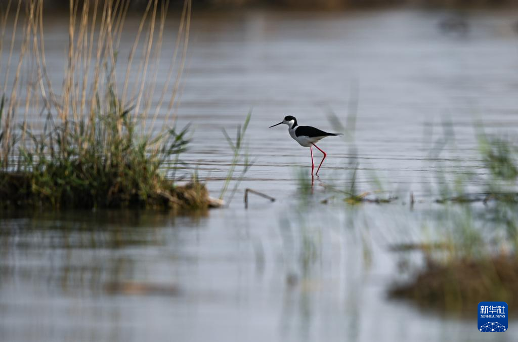 4月18日,一只黑翅长脚鹬在沙湖水域中觅食。新华社记者 冯开华 摄