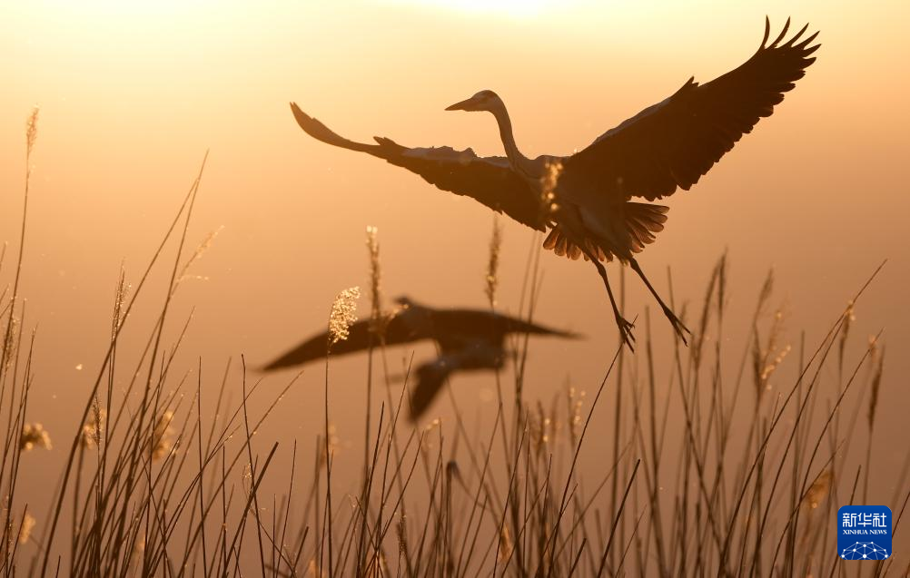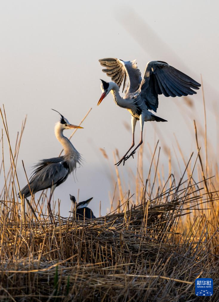 4月18日,苍鹭在沙湖芦苇丛中栖息、飞翔。新华社记者 王鹏 摄