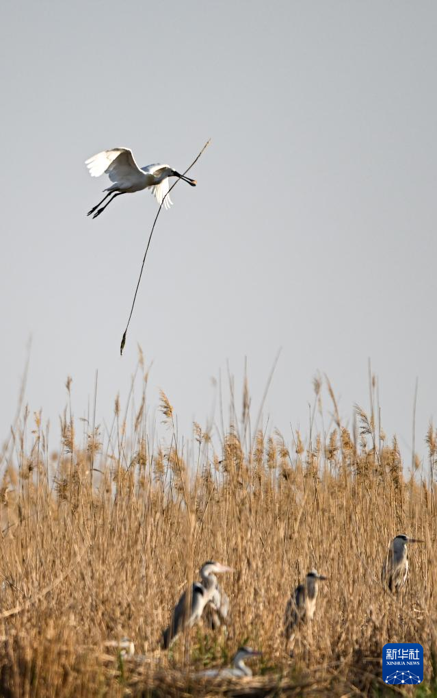 4月17日,一只白琵鹭衔着芦苇杆在沙湖上空飞翔。新华社记者 冯开华 摄