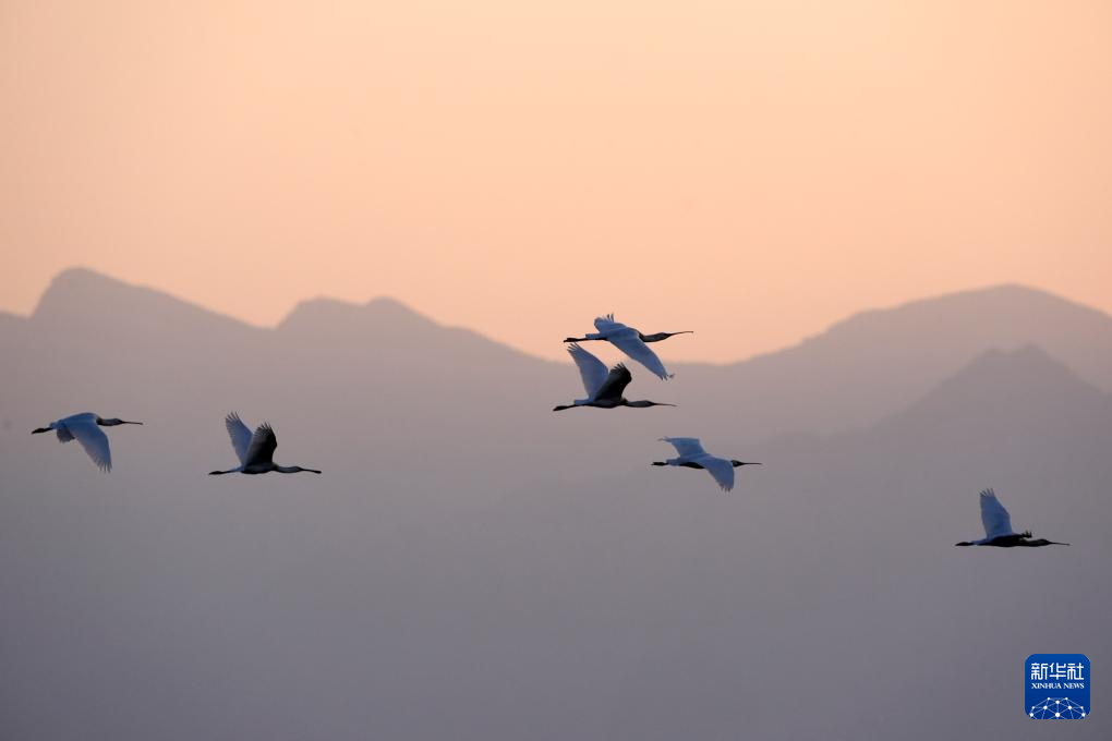 4月17日,白琵鹭在沙湖上空飞翔。新华社记者 王鹏 摄