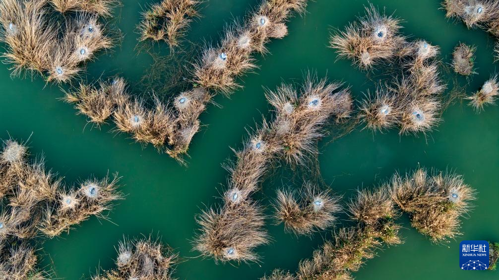 这是4月18日在沙湖拍摄的苍鹭鸟巢(无人机照片)。新华社记者 王鹏 摄