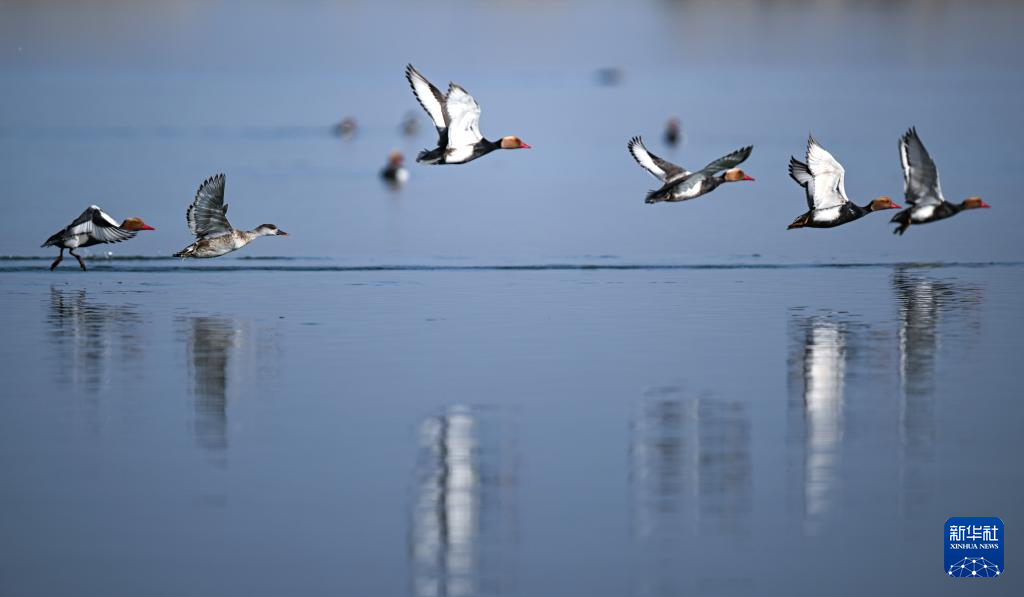 4月18日,赤嘴潜鸭在沙湖水面上飞翔。新华社记者 冯开华 摄
