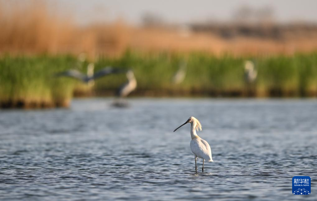 4月17日,一只白琵鹭在沙湖水域中觅食。新华社记者 冯开华 摄
