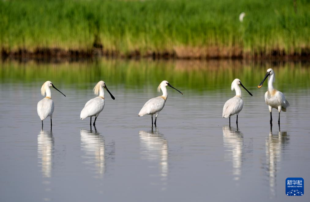4月18日,白琵鹭在沙湖中栖息、觅食。新华社记者 王鹏 摄