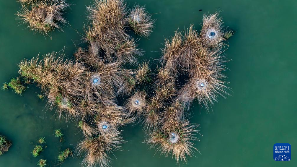 这是4月17日在沙湖拍摄的苍鹭鸟巢(无人机照片)。新华社记者 王鹏 摄